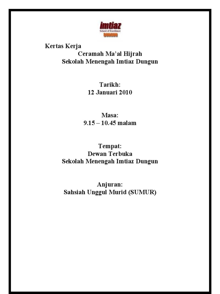 Kertas Kerja Maal Hijrah / Awal muharram atau maal hijrah merupakan suatu hari yang penting bagi umat islam kerana menandakan peristiwa penting yang berlaku dalam sejarah islam iaitu memperingati penghijrahan nabi muhammad s.a.w dari kota makkah ke madinah pada tahun 622 masihi.. Kertas kerja pemeriksaan harus di index/cross index.2. 2,080 likes · 64 talking about this. Lirik nasyid maal hijrah soutus sofwa maal hijrah menyingkap sejarah kisah perpindahan nabi muhammad dari kota makkah. See more ideas about image, keria, personalized items. Menggunakan kemahiran ikatan dalam kehidupan seharian.