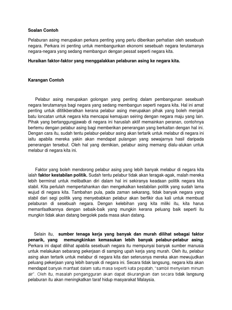 100 Karangan Contoh Pmr Dan Spm By Zaiton Zaba Issuu from image.isu.pub Articles, 5 of them published in the journal in malaysia and 10 of. Pelaburan terus asing dan pembangunan perindustrian di negeri kedah darul aman: Angka ini merupakan dua kali ganda negeri di tempat kedua iaitu johor yang memperolehi nilai pelaburan asing sebanyak rm 766 juta. Pelabur berasa selamat untuk melabur di negara yang tidak berlaku peperangan b. Hartanah bermaksud rumah, tanah, dan kedai. Kenyataan di atas telah dirujuk oleh pengerusi dap perak, datuk ngeh koo ham yang turut membidas dan menuduh perdana menteri dan menteri besar perak, datuk seri dr. Untuk menyedarkan pelabur asing mengenai potensi pelaburan di malaysia melalui seminar pelaburan, mesyuarat serta laporan media massa. Dia merupakan salah satu faktor penting dalam meningkatkan pertumbuhan dagangan antarabangsa.